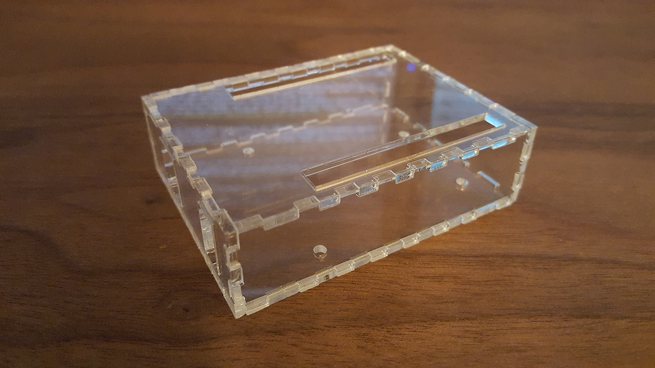 The second fabrication attempt fared better. Having redone the design (see the previous assignment for the final version) the finger joints fit together very well. However, the next problem soon became apparent: although the board fit in the case, and the pins and ports were accessible, the holes on the bottom for the mounting screws seemed to be sized as if for a smaller board. Upon reflection, I had given some generous margins to the case, yet the case that was printed was of a somewhat closer fit. I thus suspected that the case had been scaled down from the original design.