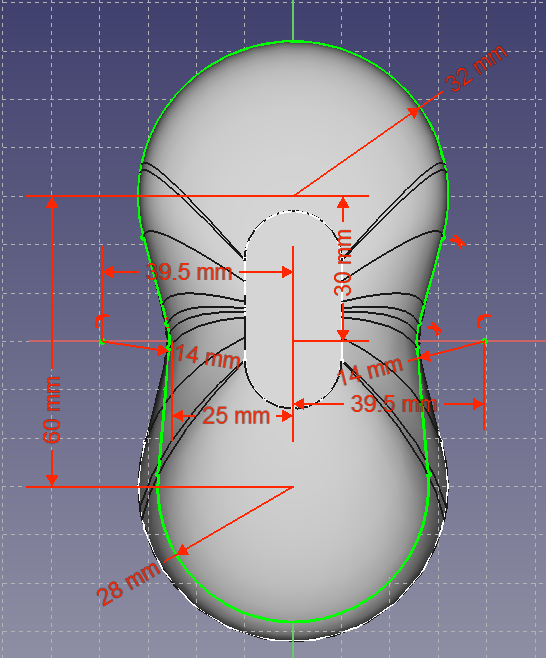 The mouse was created in FreeCad. I drew three separate layers with the sketching tools. The middle such layer is shown below. Each of the three layers were strictly constrained. Once these layers were drawn, a single loft with the solid object feature enabled completed the shape of the mouse.